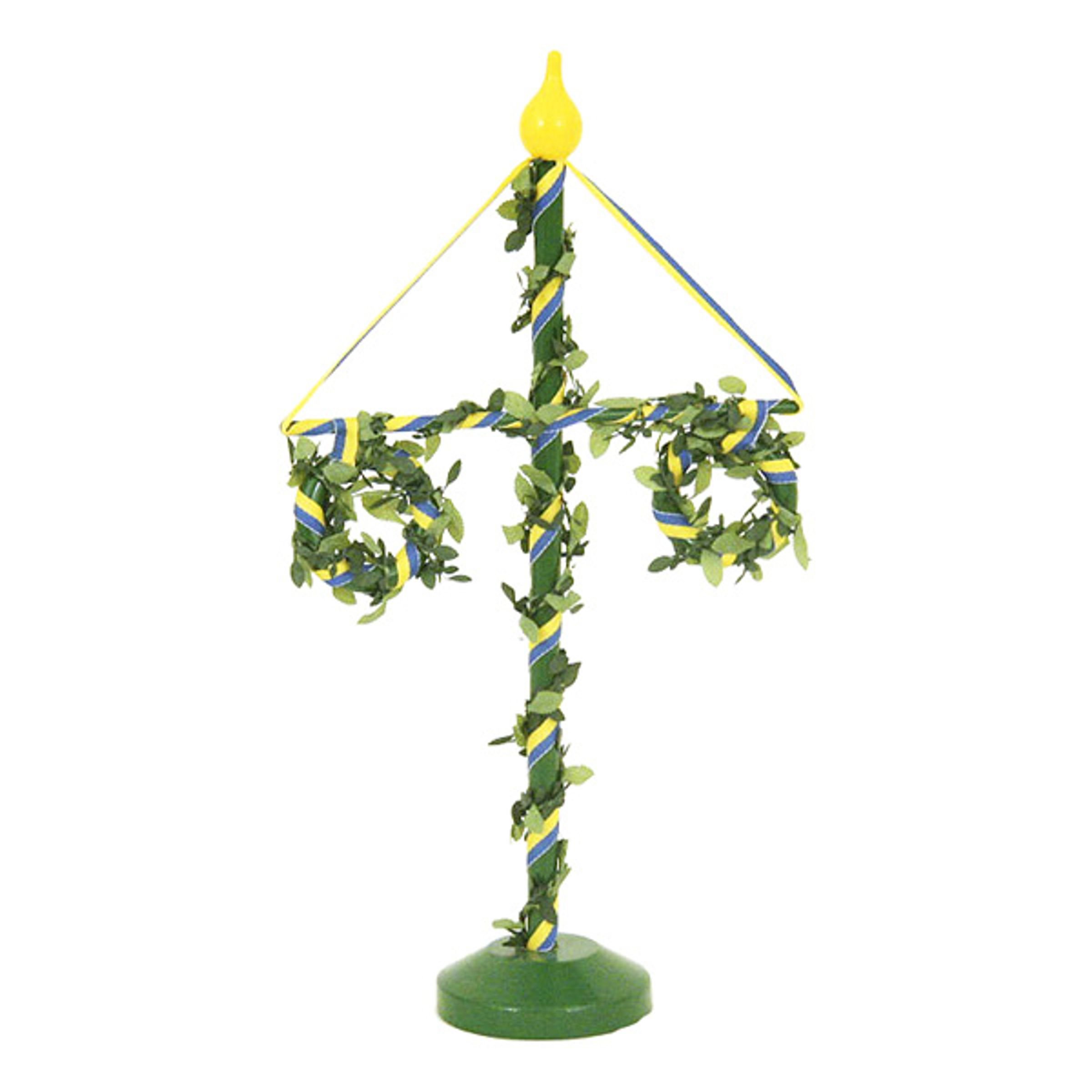 Midsommarstången kommer i traditionellt utförande med fint dekorerade gröna blad och blågula band med en gul knopp på toppen. Stången är målad i grön färg och är tillverkad i trä.