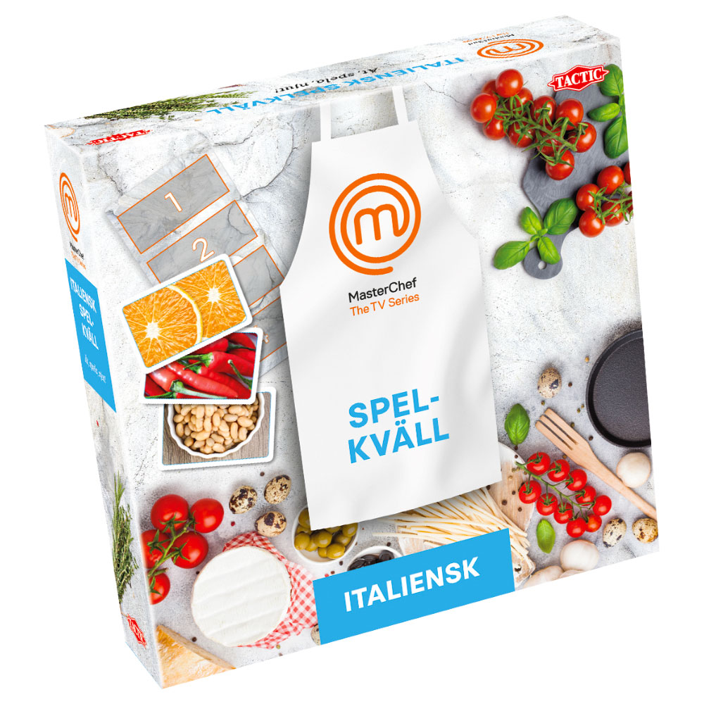 Matspel med fokus på Italiensk mat! Tycker du om mat, är en mästerlig kock eller faktiskt borde förbjudas att vara i köket, oavsett – detta roliga sällskaps-spel kommer garanterat få er att skratta! Med en serie minispel ska ni samla ihop de bästa ingredienserna genom att slå de andra, men kom ihåg att allt kan vändas uppochner i detta familjespel, allt hänger på den sista måltiden!Sveriges Mästerkock: Italiensk Spel Kväll omfattar ett familjespel med snabba mini-omgångar som gör att spelarna kan samla på sig ingredienskort som de kommer att behöva för att kunna skapa sina slutgiltiga måltidsmästerverk i slutet av spelet.Info om Sveriges Mästerkock: Italiensk Spel Kväll:- Ålder: 14+.- Speltid: 20+ min.- Antal Spelare: 3-4 personer.- Mått Förpackning: ca 22 L x 22 B x 5 H cm.Sveriges Mästerkock: Italiensk Spel Kväll Innehåller:- 150 x Kort.- 12 x Poängbrickor- 1 x Poängtavla.- 1 x Korthållare.- 1 x Duk-kort.- 1 x Tomt…