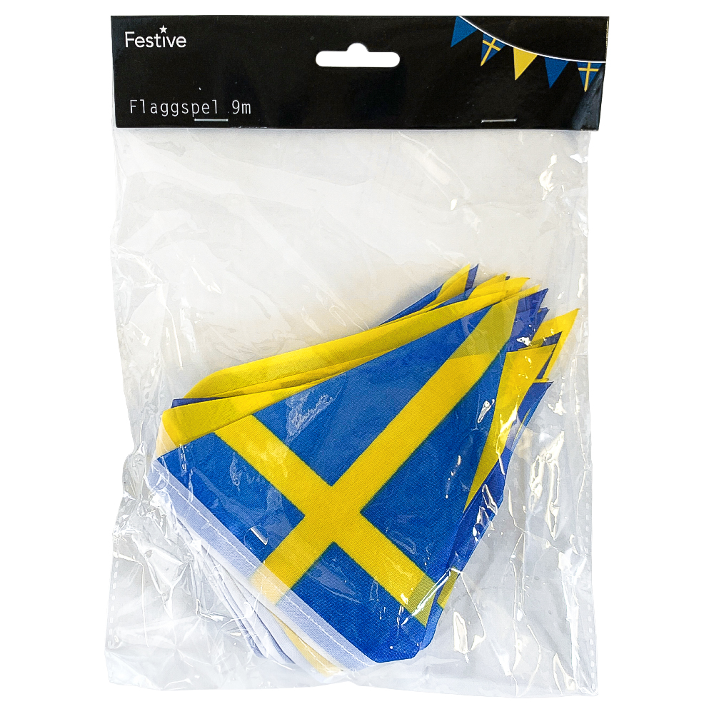 Fin flaggirlang i tyg med svenska flaggan som blir en härlig dekoration och festligt pynt och passar utmärkt för dig som vill ha en girlang full av toppenfina Sverige flaggor. Med denna vimpelgirlang får du enkelt till en snygg girlang dekoration som passar perfekt till födelsedag, student, nationaldag, midsommar och sommar kalas. Vimpelgirlang Sverige Flaggor omfattar en vimpelgirlang med Sverige flaggor tillverkade i polyester på vitt band. Flaggorna är ca 11 cm breda och 15 cm höga och girlangen är ca 9 meter lång. Info om Vimpelgirlang Sverige Flaggor: – Girlang med svenska flaggan. – Mått Girlang: ca 9 meter lång. – Mått Flaggor: ca 11 B x 15 H cm. – Material: Polyester.